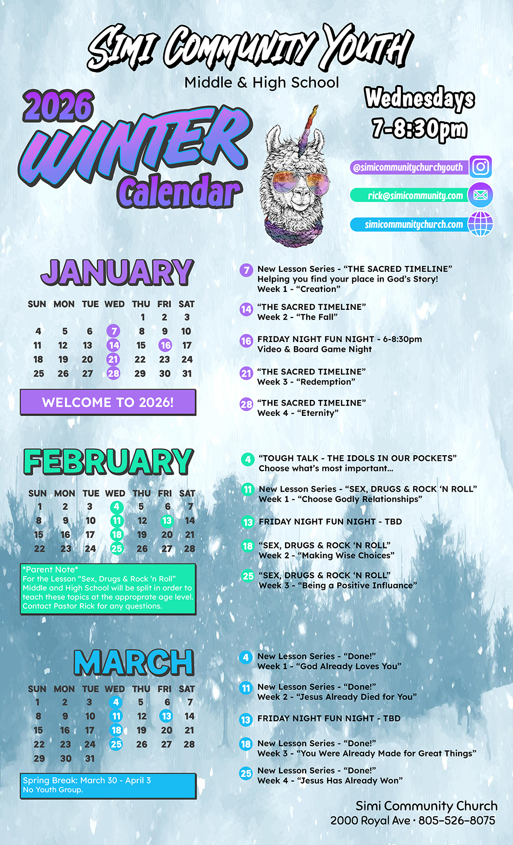 We want all of our youth to know Jesus Christ and to find their ultimate joy and satisfaction in Him. We have designed our youth ministry to deepen understanding of the greatness of our God, and to give encouragement in the pursuit of godliness. Check out our Students' Calendar below to see any upcoming events for the youth of Simi Community Church and contact Pastor Rick Robledo with any questions you may have in regards to our youth ministry.